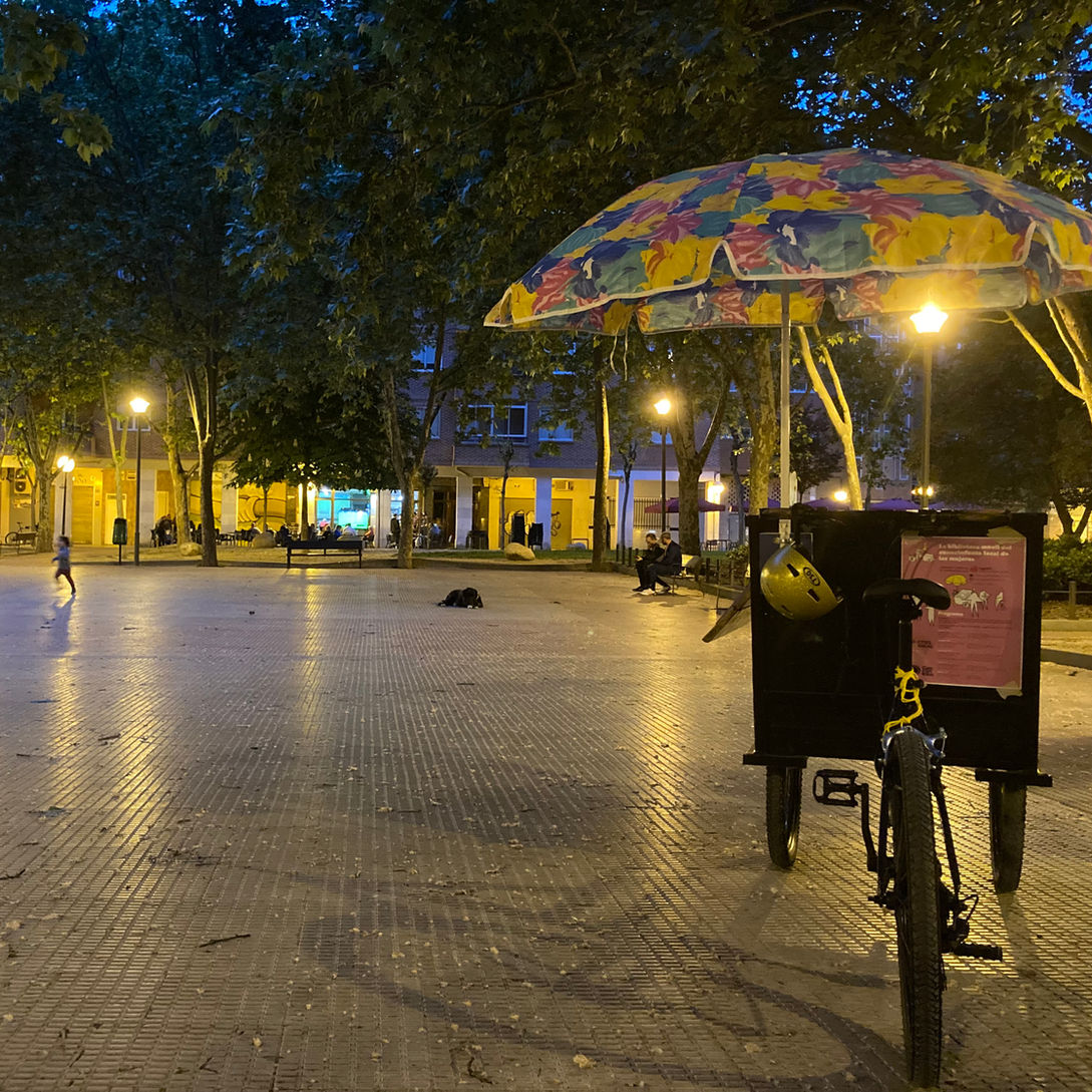 Hierzu bauten wir ein Lastenrad zu einem flexiblen Ort für temporäre Aktionen um - ein Sonnenschirm, ein Tisch und eine kleine Bibliothek verwandelten das Fahrrad in eine mobile Bibliothek. In einer Reihe von Workshops befassten wir uns aus der weiblichen Perspektive mit unterschiedlichen Themen rund um die Stadt. Am ersten Tag waren Textfragmente von der Autorinnengruppe 8 Hembras Ausgangspunkt für eine silent conversation [stilles Gespräch] zum Thema care, repair and heal [sorge tragen, reparieren, heilen]. Am nächsten Tag folgten wir den Geräuschen und Gerüchen der Nachbarschaften San José y Madre de Dios in zwei Stadtteilspaziergängen, bei Tag und bei Nacht. Am dritten Tag versammelten wir uns mit interessierten Frauen zu einem Hexenkreis im Keller der Bibliothek. Der Workshop wurde geleitet von Leticia Utermoehl von der lateinamerikanischen Frauengruppe Janainas e.V.. Neben den Workshops radelten wir durch die Stadtteile, nahmen an lokalen Festen teil und veranstalteten spontane Picknicks und Gesprächsrunden. Aktivitäten der Bibliothek Rafael Azcona wurden in den öffentlichen Raum verlagert. In einem Abschlussworkshop wurde das gesammelte Wissen in Zusammenarbeit mit lokalen Illustratorinnen in eine 25 Meter lange Buchrolle übertragen und in der Bibliothek ausgestellt. Auch die mobile Bibliothek, das umgebaute Lastenrad, verbleibt für Aktionen in den Händen der Nachbarschaft und der lokalen Bibliothek.